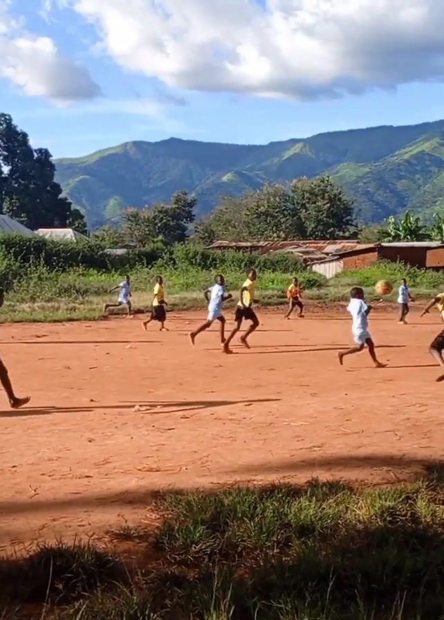 A wide-angle outdoor shot depicts a group of young children playing soccer on a reddish-brown dirt field