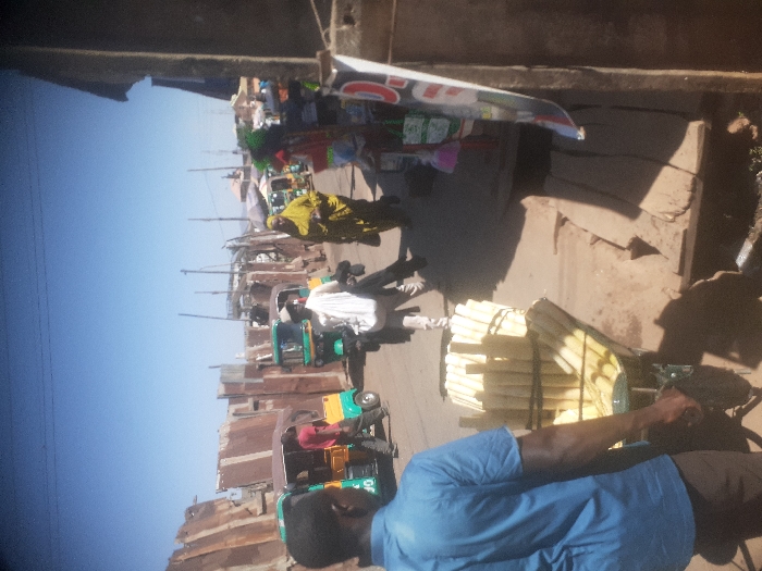 This image captures a bustling street scene within a market or commercial district in Jos, Nigeria, under a clear blue sky