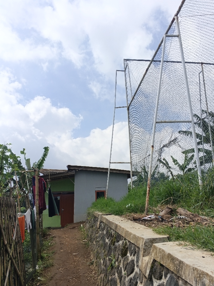 A dirt path runs along a stone wall and a wire fence, leading to a small, gray building with a brown door and window. Clothes hang on a line near the fence. To the right, a tall metal structure covered in netting rises above green grass and foliage. The sky is partly cloudy, with patches of blue visible.