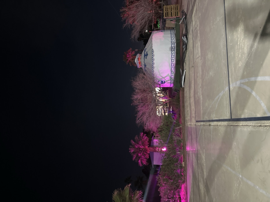 A yurt stands on a concrete surface with basketball court markings. The yurt is white with a blue patterned border and a symbol near the base, illuminated by pink light. Nearby trees and bushes are also bathed in pink light, contrasting against the dark night sky. A small structure, possibly a stage, is visible behind the yurt.