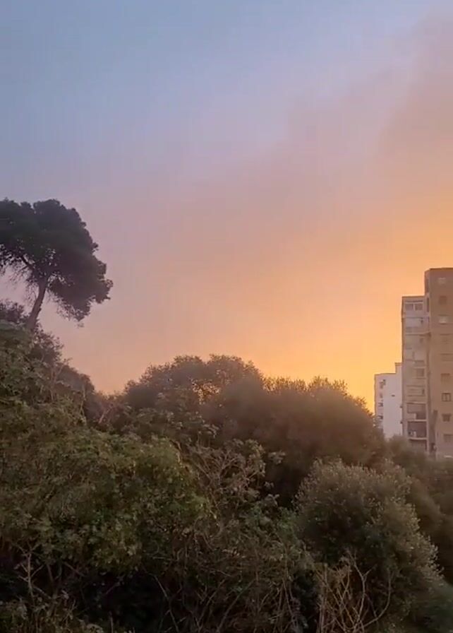 colorful sky, transitioning from blue above to orange and yellow near the horizon, suggesting a sunset or sunrise. In the foreground, there is dense green foliage, possibly a collection of trees and bushes. A tall building can be seen in the background, its façade lit by the sun. The footage appears to be taken from a high vantage point, potentially a balcony or window, as part of a ceiling is visible at the top of the frame.