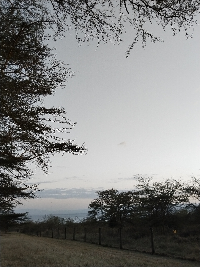 A landscape scene depicts a muted, gray sky framed by bare tree branches at the top and left. A fence stretches across the lower part, separating dry, golden grass. In the distance, silhouettes of sparse trees line the horizon, with a faint band of water or haze visible beyond. The overall impression is one of desolation and quiet stillness.