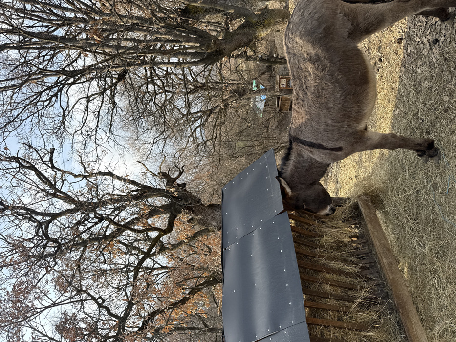 The image depicts a rural scene in Starosel, Bulgaria, likely during late autumn or winter. A single adult donkey, predominantly grey-brown with a darker dorsal stripe, stands in the foreground, facing left. Its head is lowered, actively feeding from a wooden hay feeder with a black corrugated roof. The feeder contains a substantial amount of dry hay. The ground around the feeder is covered with scattered hay and dry earth. In the mid-ground and background, numerous deciduous trees stand mostly bare, with some retaining dry, light brown leaves. The sky is partially visible, showing a light blue hue with some cloud cover. Further in the background, among the trees, a small wooden structure with a blue tarp roof and another smaller wooden shelter or feeder are faintly visible. The overall impression is one of a pastoral, outdoor animal enclosure.