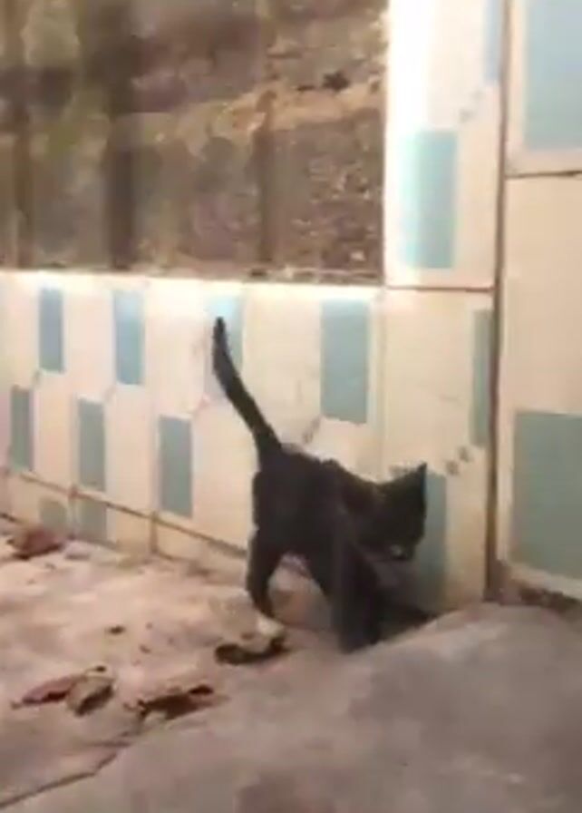 Two kittens are playing in an outdoor area. One kitten is completely black, while the other is a gray and white mix. They are near a wall with light blue and white tiles along the bottom. The ground is concrete with some debris. The kittens are running and chasing each other.