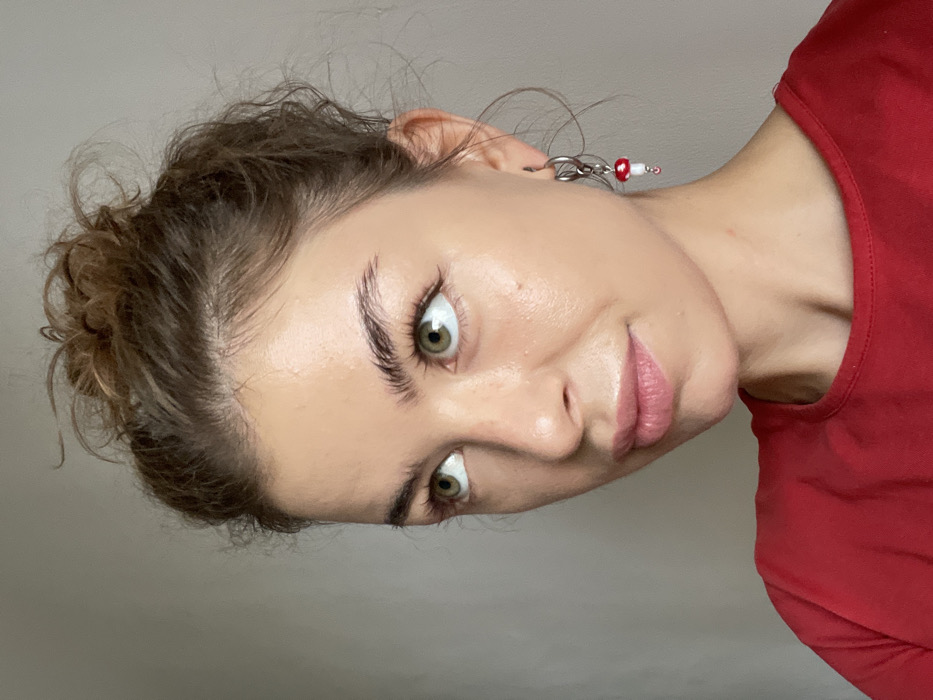An image captured in Boreti, Montenegro, features a young adult female from the chest up, positioned slightly to the right of the frame. She possesses light skin, light green eyes, and brown hair styled in a messy bun. Her head is angled slightly to the left, with her gaze directed upwards and to the left. She wears a plain red top. A silver-colored hoop earring, from which a red and white mushroom charm and a small red bead dangle, is visible on her right ear. The background consists of a plain, light grey wall.