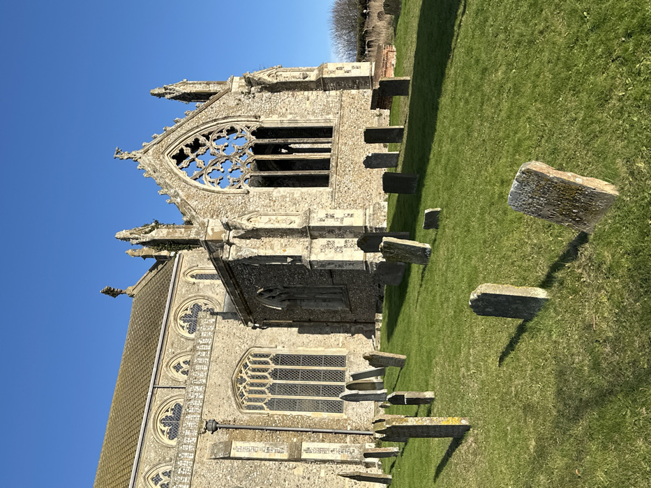 The image depicts a stone church and its adjoining graveyard, located in the city of North Norfolk, United Kingdom