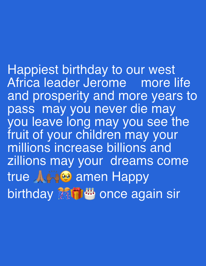 This image is a digital graphic featuring white text and emojis on a solid, vibrant blue background. The text comprises a birthday message, specifically wishing "Happiest birthday to our west Africa leader Jerome" with aspirations for "more life and prosperity and more years to pass." The message continues with blessings such as "may you never die may you leave long may you see the fruit of your children may your millions increase billions and zillions may your dreams come true." This is followed by three folded hands emojis (🙏), a face holding back tears emoji (🥹), the word "amen," and then "Happy birthday 🥳🎁🎂 once again sir," which includes a party popper emoji, a wrapped gift emoji, and a birthday cake emoji. There are no individuals, physical objects, or environmental details present, indicating a purely digital construct rather than a photograph of a real-world scene. No discernible physical location is depicted.