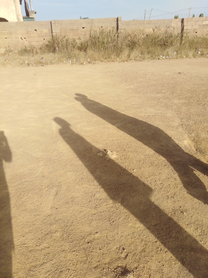 The scene depicts an outdoor environment in Jos, Nigeria, under direct sunlight, indicated by pronounced, elongated shadows cast on reddish-brown dirt ground