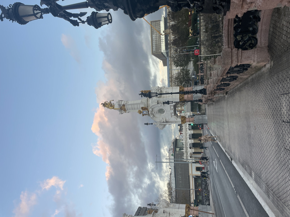 The photo showcases a bridge with ornate lamps and decorative elements. A tall, white monument adorned with a golden statue stands on the bridge, partially obscured by clouds. The sky is a mix of blue and gray, suggesting either sunrise or sunset. A building with "TABAKALERA" signage is visible in the background, and traffic lights are also discernible. The photograph presents a scenic urban landscape under an expressive sky.