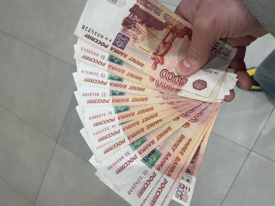 A hand holds a fan of Russian 5000 Ruble banknotes