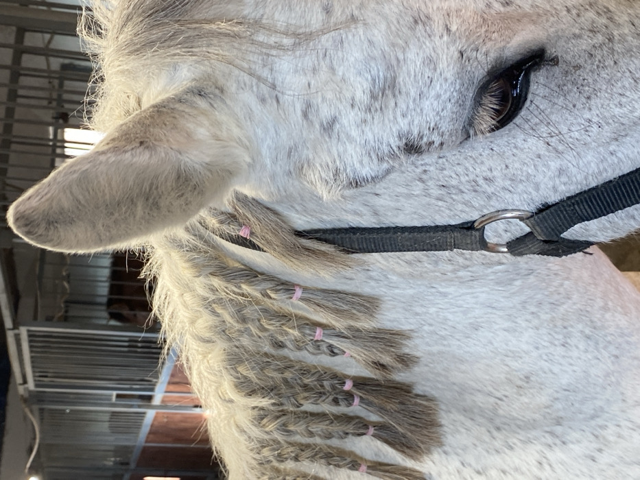 The scene is set indoors within a stable environment in Podlastva (Poljice), Montenegro. The primary subject is a dapple grey horse, viewed in a close-up, cropped perspective. The horse's visible features include its right ear, a portion of its forehead, and its right eye, which appears dark and reflective. Its mane is elaborately braided into multiple small, parallel sections along its neck, each braid secured at the end with a pink elastic band. A black nylon halter with a silver-colored metal ring is visible around the horse's head. In the background, out of focus, are horse stalls constructed with metal bars and wooden partitions. A dark-colored horse is partially discernible within one of these background stalls. The lighting suggests an artificial indoor environment.