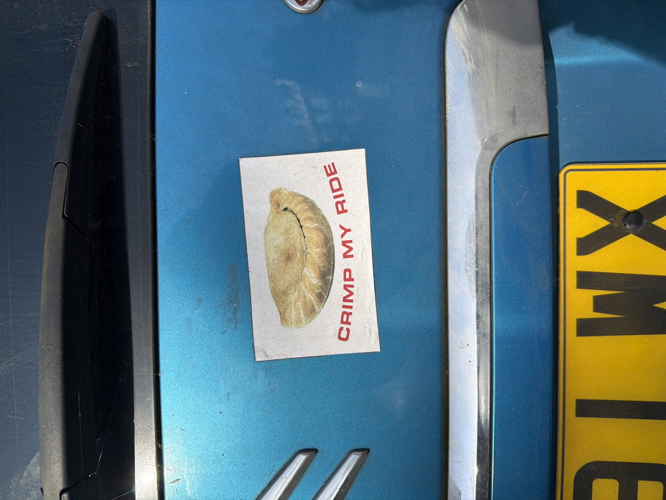 The image displays the rear section of a teal/metallic blue vehicle, likely a hatchback or SUV, under bright daylight. A black rear windscreen wiper assembly is visible horizontally across the top of the frame. Below this, a white rectangular sticker is affixed to the vehicle's body panel. The sticker features an illustration of a golden-brown Cornish pasty and the red text "CRIMP MY RIDE" in capital letters. To the immediate left of the sticker, a portion of a chrome vehicle emblem, resembling two upward-pointing chevrons, is visible. Below the sticker and emblem, a horizontal chrome trim piece spans the width of the frame. At the very bottom, the upper section of a yellow UK vehicle registration plate is visible, displaying black characters including "91 WX", with a black bolt securing the plate near the 'X'. The vehicle's make and specific location within London, United Kingdom, cannot be definitively determined from the visual evidence beyond the UK registration plate format. No individuals are present.