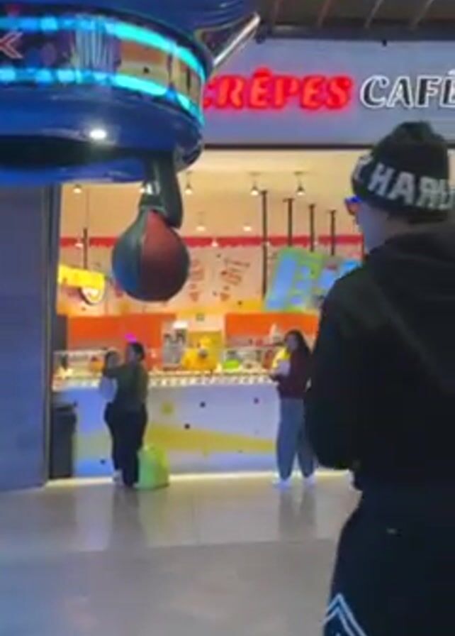 A young man wearing a black hoodie, basketball shorts, sunglasses, and a beanie, is punching a mechanical boxing machine in a mall. The machine is blue with lights. Behind him is a “Crepes Cafe” stall with people in line. Other people are walking in the background.