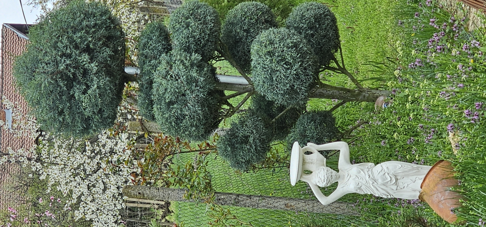 garden scene, possibly located in the city of Vratsa, Bulgaria, given the architectural style visible. A tree with multiple spherical, blue-green foliage clusters dominates the view. A white statue of a woman holding a pitcher lies on its side in the grass. The surrounding area is a mix of green grass, wildflowers (primarily purple), and other vegetation. A portion of a brick building with a red tiled roof is visible on the left side of the image. A fence runs through the middle of the scene. A decorative owl is peeking through the grass behind the tree.