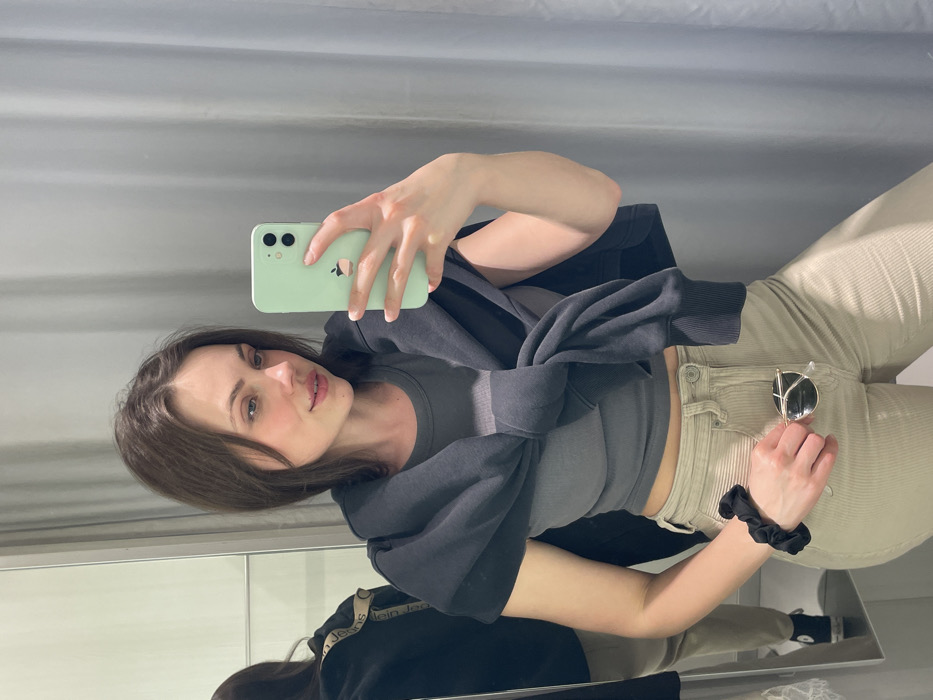 The image depicts a young adult female capturing a mirror selfie within what appears to be a modern retail fitting room. The subject, with medium-length brown hair and fair skin, gazes towards the smartphone she is holding. She is dressed in a fitted grey sleeveless top and light beige corduroy pants, with a dark grey sweatshirt tied around her shoulders. Her left wrist carries a black scrunchie, and she holds round, silver-framed sunglasses in her left hand. A light green iPhone, featuring a visible Apple logo and dual rear cameras, is held in her right hand, angled to photograph her reflection. The full-length mirror, positioned on the left, reflects the subject's back, revealing a dark garment with a "Calvin Klein Jeans" branded strap. The right side of the frame shows a light grey curtain, indicative of a private changing area. This environment is consistent with a contemporary commercial space, not a location within the ancient city of Pompei, Italy.