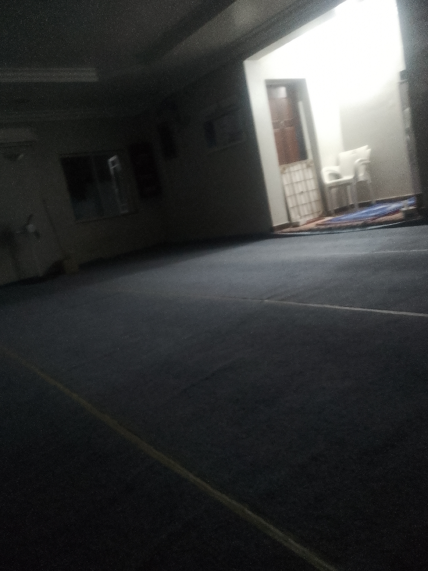 The image depicts an interior scene, characterized by a large, dark-carpeted room in the foreground and a brightly lit adjacent area in the background to the right