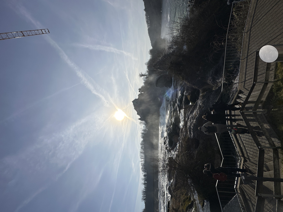 This image depicts a panoramic view of the Rhine Falls in Neuhausen am Rheinfall, Switzerland, captured on a brightly lit day. The sun, a prominent luminous disc with visible rays, is positioned in the upper-center sky, casting a strong backlight over the entire scene. The sky is light blue with multiple white contrails crisscrossing, and a segment of a yellow construction crane boom is visible in the upper right corner. In the mid-ground, the powerful Rhine Falls cascade extensively over rocky terrain, generating significant mist that partially obscures the historical Schloss Laufen (Laufen Castle), situated on a cliff overlooking the falls. The river continues downstream to the right. The surrounding landscape features bare trees and bushes, suggesting a cooler season. In the immediate foreground, a multi-level wooden viewing platform with dark metal railings is visible. Six individuals are present on this platform, predominantly viewed from behind and silhouetted by the sun. One person on the far left, wearing a dark coat and a red backpack, is holding a device up, likely a camera or phone, directed towards the falls. To their right, another individual wears a light-colored backpack, standing near a small child. The people are observing the falls. Long, distinct shadows are cast by the railings and individuals across the wooden platform. A cylindrical metal post with a circular, reflective top is situated on the lower right section of the platform.
