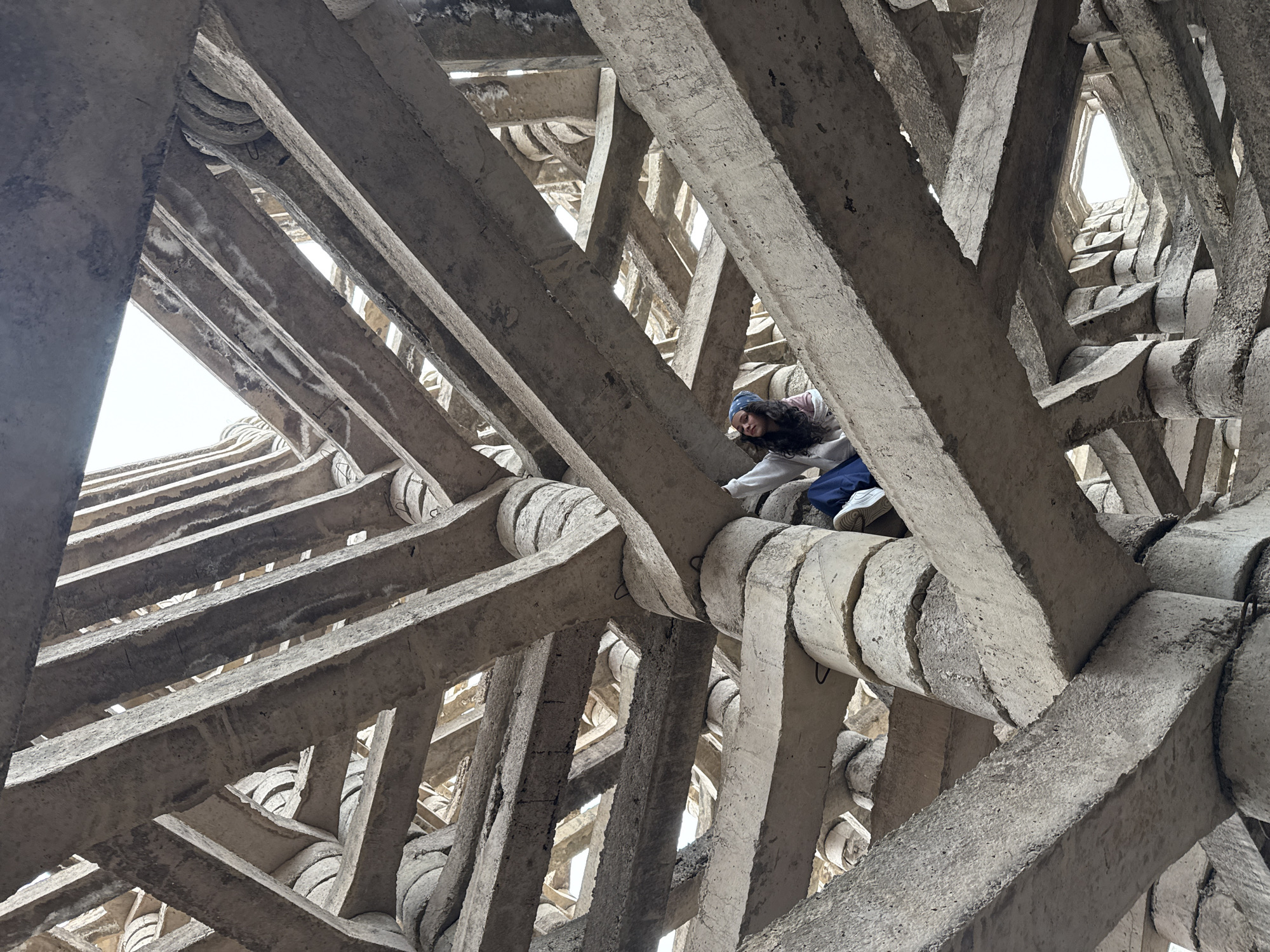 The image displays an upward view within a complex, multi-tiered architectural structure composed of concrete or weathered stone, located in Areni, Armenia. The structure features a dense, interwoven lattice of thick, horizontal and diagonal beams supported by stacked, cylindrical columns. These elements form numerous square and rectangular openings through which bright, diffused light from above is visible. In the upper right quadrant of the scene, a female individual is partially visible, positioned within the framework of the structure. She has long, dark, curly hair and wears a light-colored, long-sleeved top over a pinkish garment, along with a blue headscarf or bandana. Her right arm is slightly raised, and she looks upwards and to the left with a subtle smile. Her left foot, clad in a white sneaker, is visible, resting on one of the beams. The surfaces of the concrete/stone beams and columns exhibit a textured, rough appearance with varying shades of grey, indicating age or unpolished construction.