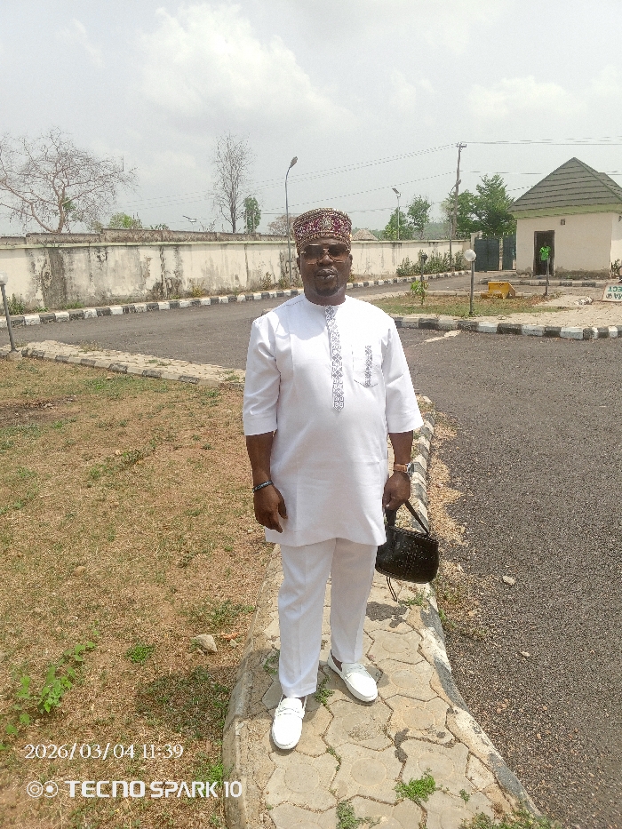A full-body photograph taken in Lokoja, Nigeria, on 2026/03/04 at 11:39, depicts an adult male standing on a concrete paver sidewalk, facing the camera