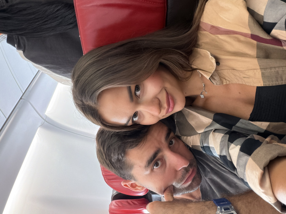 The image depicts two individuals, an adult female and an adult male, inside the cabin of an airplane. The environment features white overhead panels, air vents, and red aircraft seats, indicative of an AirAsia flight. AirAsia's main hub is Kuala Lumpur International Airport (KLIA) in Sepang, Malaysia, suggesting the flight is associated with this location. The female subject, positioned on the right and slightly in front, has long brown hair and is looking directly at the camera with a faint smile. She wears a light-colored plaid button-up shirt over a black undergarment and a silver necklace with two small charms. The male subject is positioned to the left and slightly behind the female, resting his head on her right shoulder. He has short dark hair and stubble, and is wearing a dark grey t-shirt. His left hand is raised to his left cheek, gently pulling the skin to create a pouting or exaggerated sad expression while looking at the camera. A blue digital watch is visible on his left wrist. A third individual is partially visible in the upper right background, seated in a red seat behind the main subjects, with only dark hair and a dark garment visible. The interaction between the male and female suggests a casual, possibly intimate, pose for a photograph.
