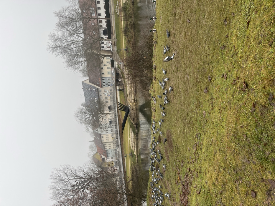 The image presents an outdoor scene along the Danube River in Tuttlingen, Germany, under an overcast sky. In the foreground, a large, uneven grassy area occupies the lower half of the frame. This grass exhibits varying shades of green, yellow, and brown, with visible patches of dark soil and fallen leaf debris, particularly on the left. A significant congregation of approximately fifty to sixty pigeons (Columba livia domestica), primarily grey, are scattered across this grassy expanse, most appearing stationary on the ground, while one pigeon is captured in mid-air near the center-right. Closer to the water's edge, at least seven mallard ducks (Anas platyrhynchos) are visible, some on the grass and some partially submerged in the river. A large, bare deciduous tree with discernible clusters of mistletoe occupies the far left of the foreground. The midground features the dark, calm surface of the Danube River, flowing horizontally across the frame and reflecting the muted light and surrounding structures. Spanning the river is the modern Fußgängerbrücke "Gabel" (Pedestrian Bridge "Fork"). This bridge has a light-colored walkway and railings, supported by a distinctive black, angular structure that extends from the riverbank, resembling a large, stylized fork. On the opposite riverbank, a paved pathway or road is visible, with at least two white passenger vehicles parked. In the background, beyond the river and road, a row of multi-story buildings lines the street. These structures display diverse architectural styles and color palettes, including cream, light blue, yellow, a prominent reddish-orange building, and white. Their roofs are typically tiled or feature dark grey slate. Numerous bare deciduous trees are interspersed among the buildings and along the riverbanks, reaching towards the light grey, featureless sky that dominates the upper third of the image. No human figures are distinctly visible.