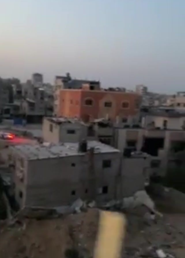 The camera is mounted on a rooftop, and it pans slowly across a densely populated urban landscape. The area is filled with closely packed buildings, primarily one to three stories high, many of them grey or beige concrete. Some have water tanks on the roof. In the distance, an emergency vehicle with flashing red lights can be seen, but no people are discernible in the image. The sky is a hazy light blue, suggesting it's either early morning or late evening. Electrical cables and other rooftop equipment are scattered around the surface where the camera is situated.