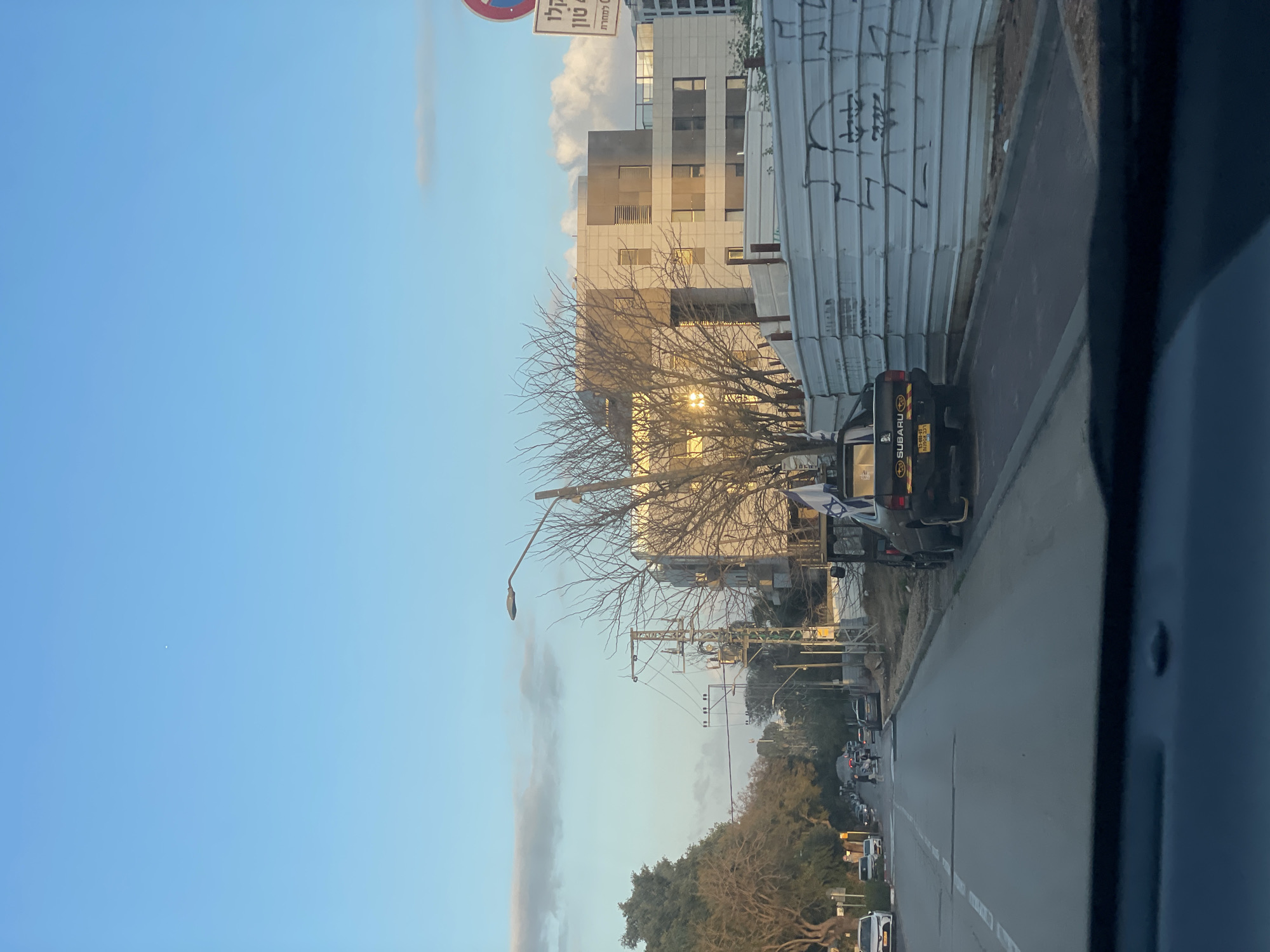 The image depicts a street in Raanana, Israel. A black Subaru SUV is parked on the right side of the road, partially obscuring a building under construction with corrugated metal fencing. The fence has graffiti. A bare tree is in the foreground, partially obscuring the buildings beyond. Street lights and utility poles line the road. The sky is blue with some light clouds. The road shows moderate traffic further down. The image appears to have been taken from inside a vehicle. An Israeli flag is affixed to the back of the Subaru.