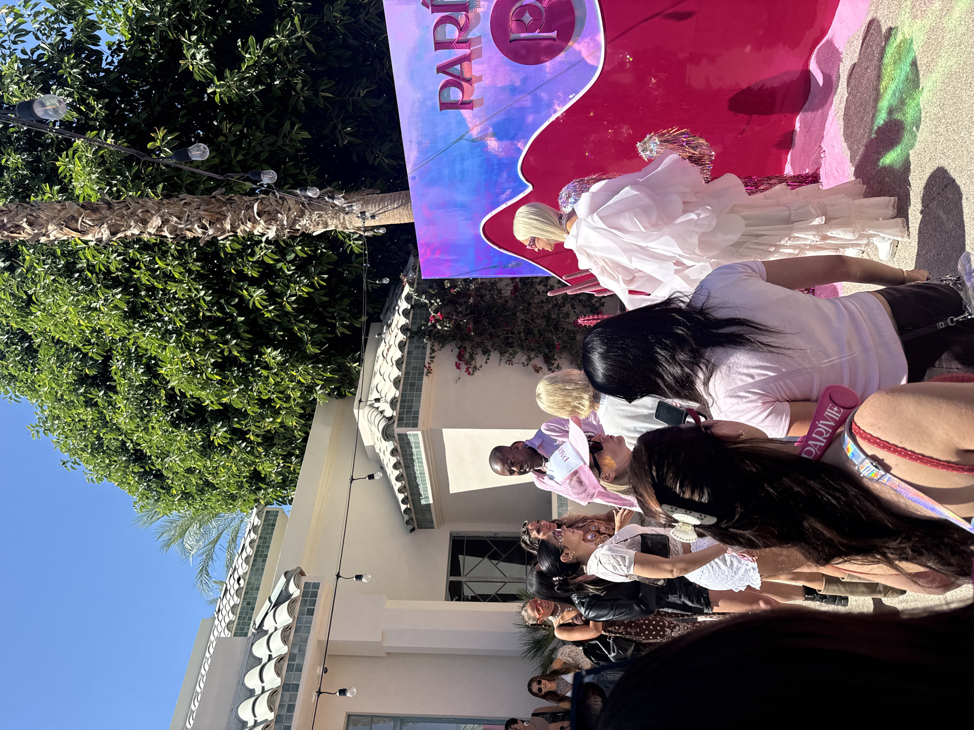 This outdoor scene in La Quinta, United States of America, captures a live event. A person with blonde hair is on stage wearing white clothing. A backdrop with the word "PARÍVE" is visible. A crowd of people is watching the performance, many holding phones to record or take pictures. The environment includes trees, buildings with white columns and tiled roofs, and string lights. The sky is bright blue. The overall atmosphere suggests a public event or performance taking place during the daytime.