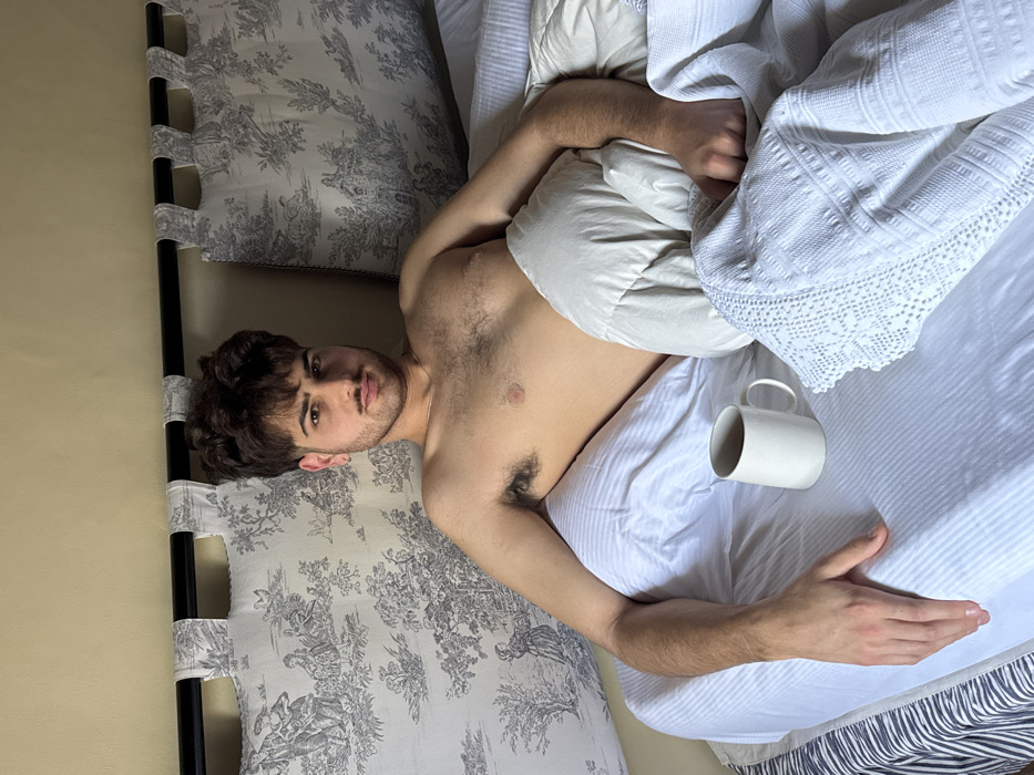 A young adult male is depicted reclining in a bed within a room located in Montepulciano, Italy. The subject, with dark curly hair, a mustache, and dark eyes, gazes directly forward. His upper torso is bare, displaying chest and armpit hair, a thin necklace, and a stud earring in his left ear. He is positioned against a bedhead comprising a black metal frame and two rectangular fabric panels patterned with grayscale toile de Jouy pastoral scenes. The bed is made with white striped and plain pillows, a white striped fitted sheet, a light-colored duvet, and a white decorative blanket featuring intricate patterns. A plain white ceramic mug containing a dark liquid is situated on the sheet beside the subject's left arm. A plain, light-colored wall is visible in the background.