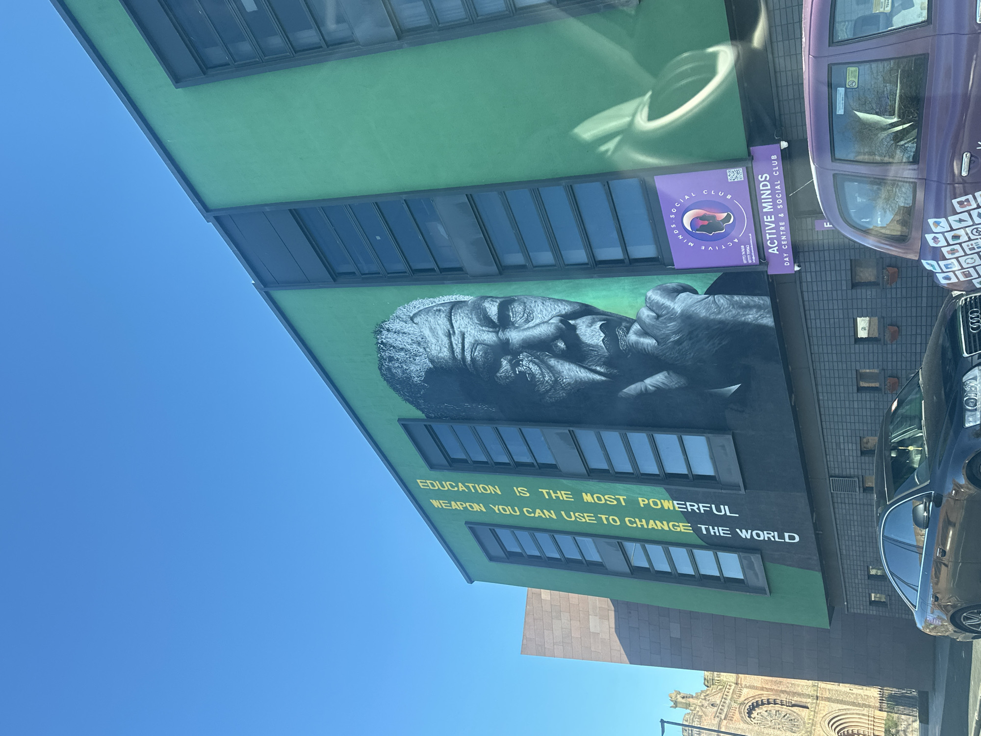 This photograph captures a mural on the side of a green building located in Liverpool, United Kingdom. The mural is a black and white depiction of a person with their hand to their face, and below the mural is the text "EDUCATION IS THE MOST POWERFUL WEAPON YOU CAN USE TO CHANGE THE WORLD." To the right of the mural, there is a sign for "ACTIVE MINDS Day Centre & Social Club." A purple vehicle and a black car are parked next to the building. In the background, there is a partial view of an old church structure. A clear blue sky is visible above the building.