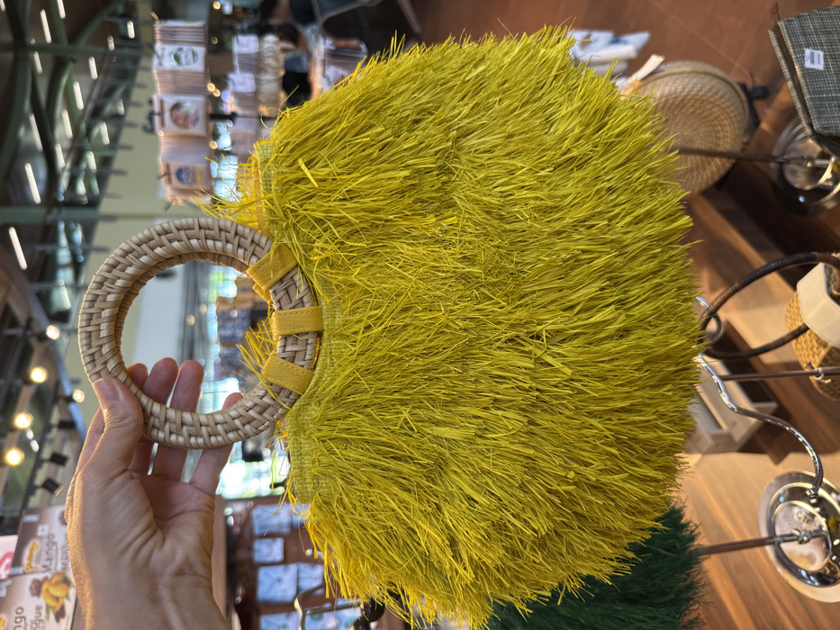 A light-skinned human hand firmly grasps a circular, woven rattan handle of a handbag in an indoor retail setting located in the City of Panglao, Philippines. The handbag itself is predominantly bright yellow, constructed from dense, shaggy, natural fibers, likely raffia or straw, giving it a voluminous, fringed texture. The rattan handle, approximately 10-12 cm in diameter, is secured to the bag's body with yellow fabric strips. In the blurred background, various retail displays are visible, including a sign partially showing "Mango" with an image of mango slices, suggesting food or souvenir sales. Other woven items, including a similar textured bag in green, are present on metal display stands. A circular woven basket and a flat, woven rectangular item are also discernible on a dark surface in the lower right. A blurred individual is partially visible in the far background on the right. The environment is illuminated by warm overhead lights.