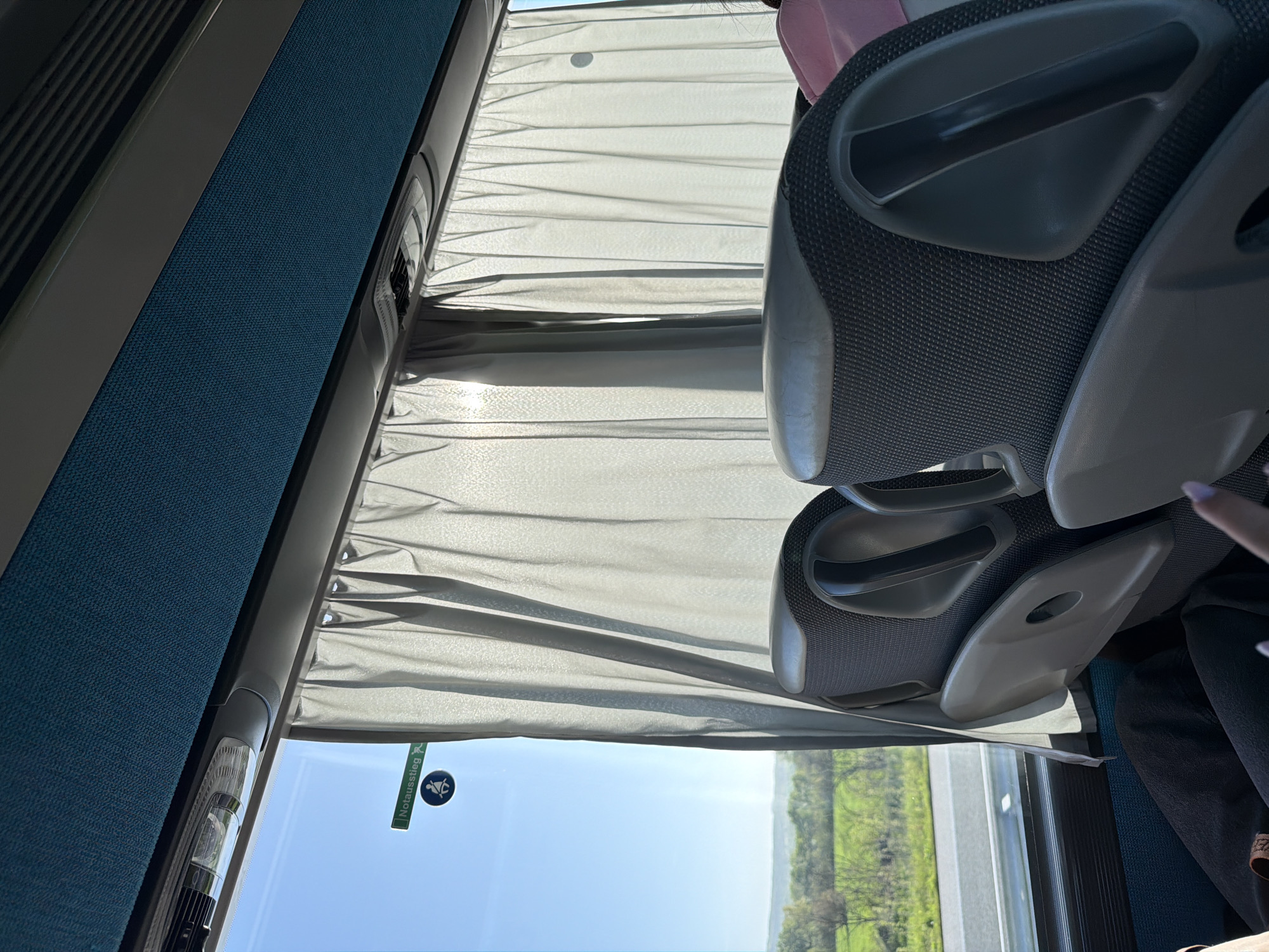 The image depicts the interior of a bus, likely during daylight hours, with a view through the window showing the landscape outside. The location is possibly near Harmanli, Bulgaria, as the emergency exit sign on the window is in German ("Notausstieg"). The bus window has a pull-down shade that is partially drawn. Two bus seats are visible in the foreground, with grey mesh fabric and plastic framing. A glimpse of another passenger's pink headrest can be seen between the seats. The window shows a clear blue sky and green fields, indicating a rural or semi-rural environment. A person's finger is briefly visible on the right side of the bus chair.