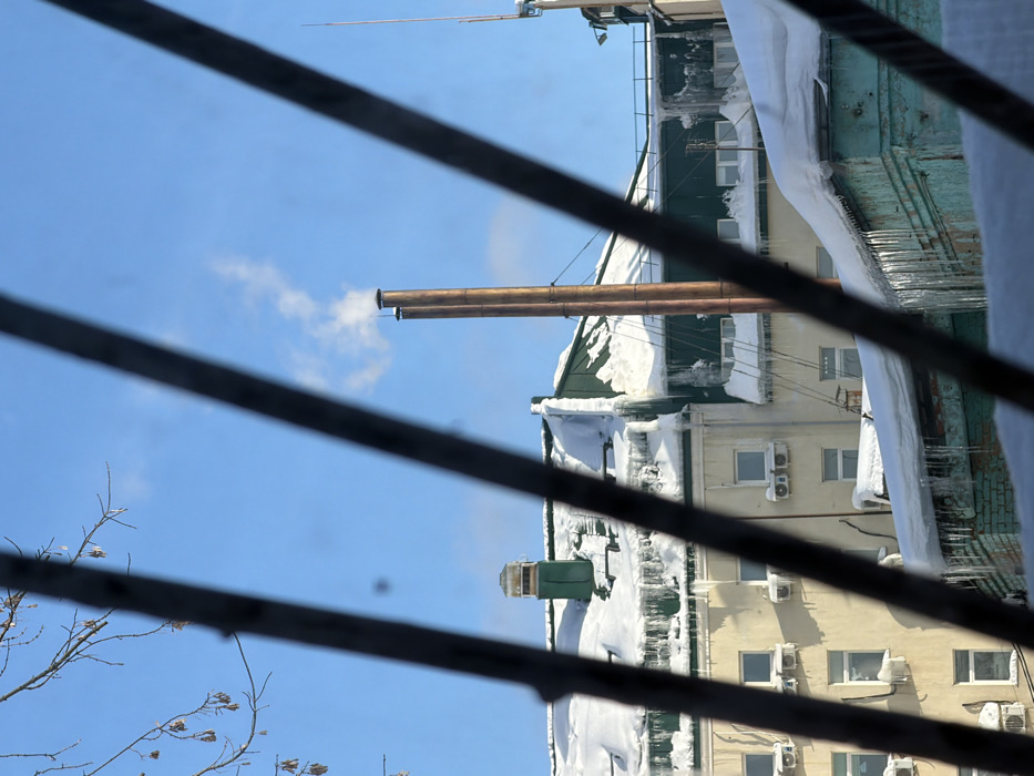 The image depicts a winter urban landscape in Sergiyev Posad, Russia, specifically showing the Sergiyev Posad Boiler House (Сергиево-Посадская котельная) and surrounding buildings. The foreground is partially obscured by four dark, out-of-focus diagonal bars, suggesting the view is through a grate or window bars. Out-of-focus bare tree branches are visible in the upper left. The scene is dominated by a clear, bright blue sky with minimal white clouds. Against this sky, two prominent, tall, slender, reddish-brown industrial chimneys are visible in the center-right, emitting a plume of white smoke vertically. Below the chimneys and to the left, a multi-story building with a cream-colored facade, numerous rectangular windows, and multiple external air conditioning units is present. Its sloped roof is dark green and heavily covered with a thick layer of white snow. Numerous long, clear icicles hang from the eaves of this roof. A shorter, green-painted chimney with a metallic cap also protrudes from this roof, similarly covered in snow. To the right of the cream-colored building, another structure with a dark green roof, also snow-laden and featuring icicles, is visible. In the lower right corner, a portion of a teal-colored building or wall is visible, also blanketed in snow and adorned with many icicles. The presence of snow, ice, and smoke from chimneys confirms a cold, clear winter day. No individuals or explicit activities are visible.