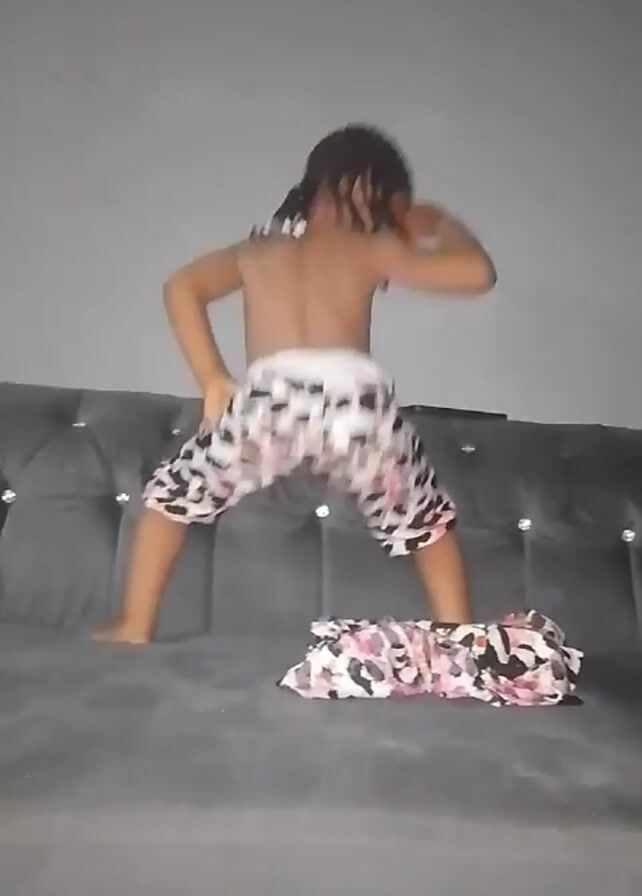 A young child is dancing on a gray button-tufted sofa. The child is wearing patterned shorts and a hair band with the same pattern, but is otherwise nude. The child's back is turned to the camera for the majority of the video, but at one point the child faces to the side. The sofa is set against a gray wall. There is also a pile of similarly patterned clothing on the sofa. The audio is music.