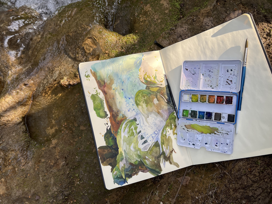 An open white sketchbook displaying a watercolor landscape painting lies on a natural, rocky stream bed in Ivanovići, Montenegro