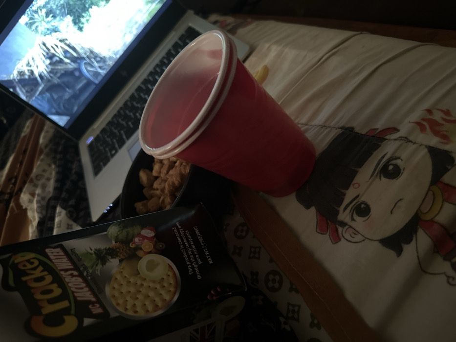 The scene depicts an indoor setting, likely a bedroom or living area, and does not provide discernible details to pinpoint a specific location within Abuja, Nigeria. In the foreground, a red plastic cup, similar to a Solo cup, rests upright on a patterned surface, appearing to contain a clear or light-colored liquid. To its left, a dark bowl is filled with numerous irregularly shaped, light brown, fried snacks. Behind these objects, a silver-colored laptop is open, displaying an outdoor scene on its screen, characterized by foliage and structural elements, possibly from a video game or movie. To the far left, a black and white bag of "Cracker MC Jacob's Water" is visible, featuring illustrations of round crackers and various fruits including pineapple, watermelon, and other tropical produce. The bag indicates a net weight of 7.05oz (200g). The objects are positioned on a soft, light-colored surface, possibly bedding or a blanket. A cartoon-style illustration of a character with dark hair, red ribbons, and a gold necklace is visible on this surface below the red cup. Further to the left, another pattern resembling the Louis Vuitton monogram is present on what appears to be another pillow or blanket strap. The overall lighting suggests an interior, possibly evening or nighttime, setting. No individuals are visible in the image.