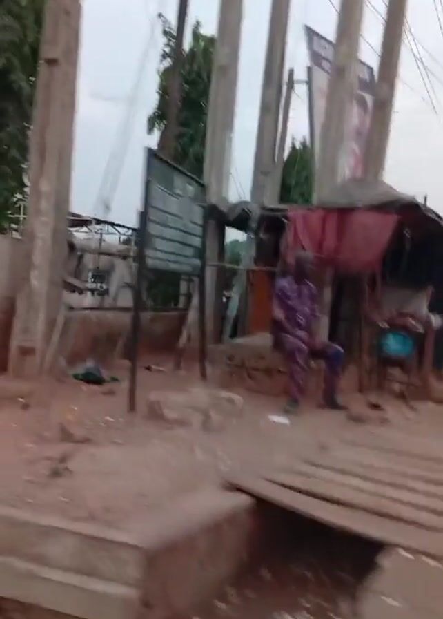 street scene. A man in a colorful shirt sits on a low wall. A wooden plank bridge crosses a ditch. Power lines hang above. The road appears dirty and littered. A sign is visible in the background. The camera pans across the scene.