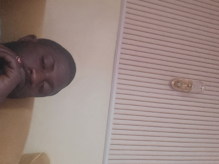 An interior scene depicts a dark-skinned male, observed from the nose down, seated with closed or downcast eyes. A ring is visible on a finger of his right hand, which rests near his chin. He is positioned on a brown upholstered surface. The background features a light beige wall below vertical light-colored paneling. Mounted on the paneling is a clear, capsule-shaped light fixture with a golden internal component. The location is the city of Babawa, Nigeria.