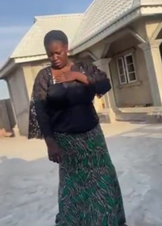 dark-skinned woman standing in front of a house. She is wearing a black top with lace sleeves and a long green patterned skirt. The house behind her is light-colored with a light gray roof. The sky is blue and sunny. The woman touches her chest and abdomen as she speaks.