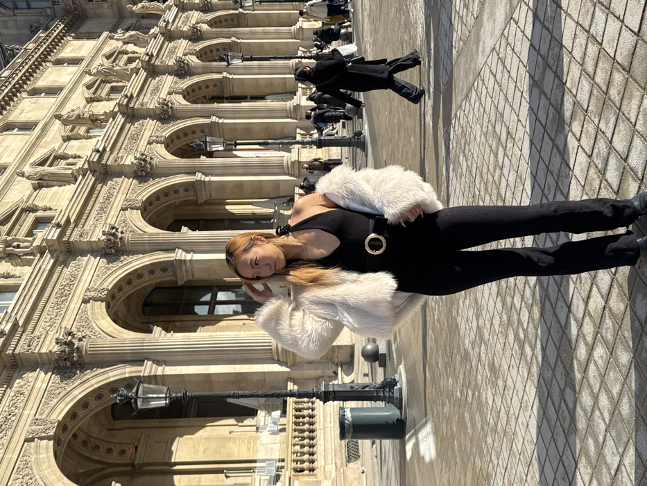 A female subject stands centrally in a paved plaza before the exterior of the Louvre Museum in Paris, France. She has light brown hair and is wearing a black halter-neck jumpsuit with a black belt featuring a prominent gold circular buckle. An off-white faux fur jacket is draped loosely over her shoulders. Her right hand is raised, touching her hair near her temple, and she looks to her left. The background consists of the ornate, light-colored stone façade of the Louvre Museum, characterized by multiple arched windows, classical columns, and statues lining the upper levels. Several traditional black street lamps are positioned throughout the mid-ground. The ground is a patchwork of light-toned rectangular paving stones, exhibiting areas of sunlight and shadow. To the left, a dark gray trash receptacle is visible. In the mid-ground and background, numerous indistinct figures are present, some walking, including one person in black attire walking away from the camera on the right. The scene is illuminated by bright natural sunlight.