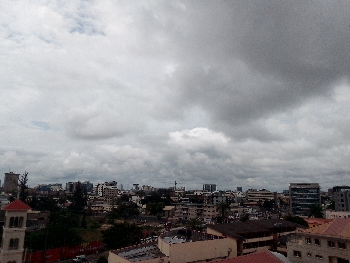 An elevated, wide-angle photograph depicts a dense urban landscape in Falomo, Nigeria, under a predominantly overcast sky