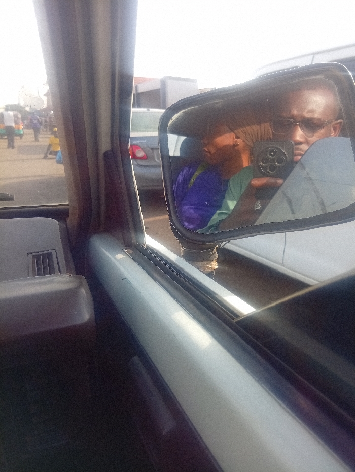 A man wearing glasses is reflected in a car's side mirror, holding a phone up to take a photo. Beside him in the back seat sits another person wearing a head covering and blue clothing. Through the front window, a street scene is visible with pedestrians and buildings in the background. The interior of the car, including the window frame and a vent, are also visible.