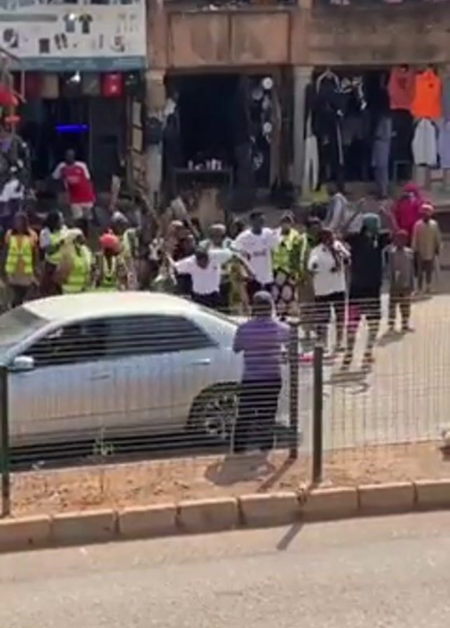 group of people dancing in front of a building. Some of the people are wearing yellow vests and others are wearing casual clothes. A person in a purple and white striped shirt is standing in front of a metal fence, possibly taking photos or videos. The building has shops on the ground floor and people watching from the upper levels. A silver car is parked behind the fence. The scene appears to be a public gathering or performance in an urban environment.