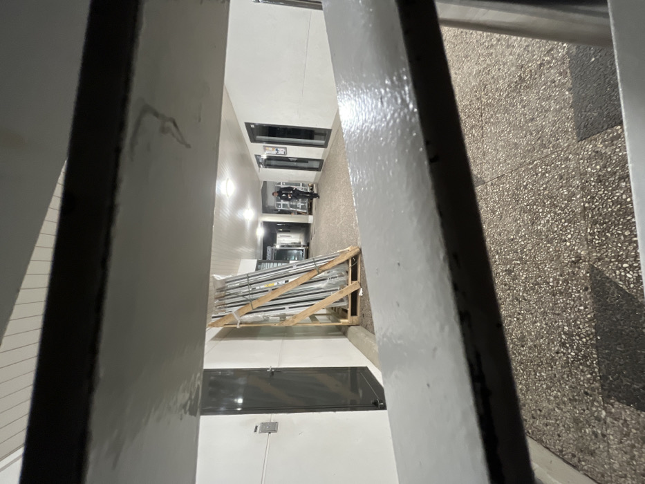 A narrow view through a painted metal railing reveals an indoor hallway. A person walks in the distance. Pallets laden with metal beams rest along the wall. A closed door is visible on the lower level. Light fixtures illuminate the scene. The floor is tiled. The hallway extends into the distance and recedes into the frame.