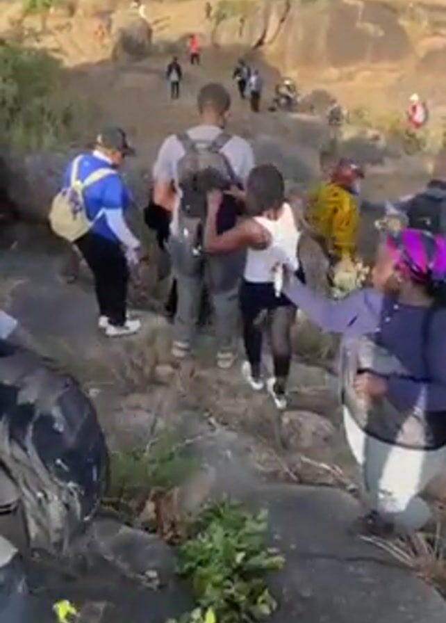 A group of people are hiking up a rocky hillside. The ground is covered in large rocks and dry grass. Some of the people are helping each other navigate the terrain. A few buildings are visible in the distance. The weather is sunny. Some people wear backpacks, and others wear hats. One woman is looking at her phone. People are wearing a variety of clothing.