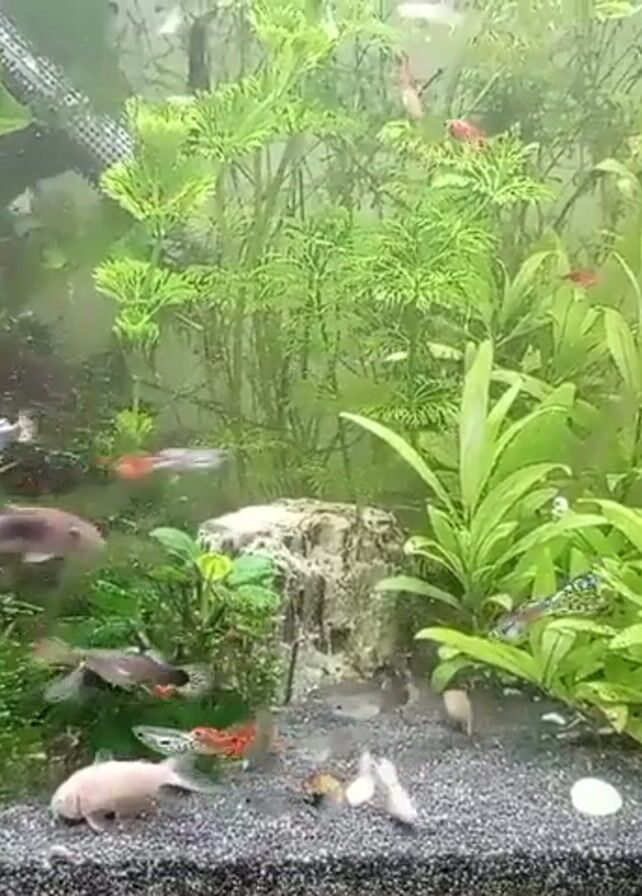 The video displays a well-established freshwater aquarium. It features numerous small, colorful fish, likely guppies, swimming among dense green aquatic plants. A light gray, rocky ornament sits in the center of the tank, surrounded by plants. The tank has a dark, possibly black, gravel substrate. The water appears clear, though slightly blurred, with some particulate matter visible. The background is out of focus, suggesting the aquarium is indoors.