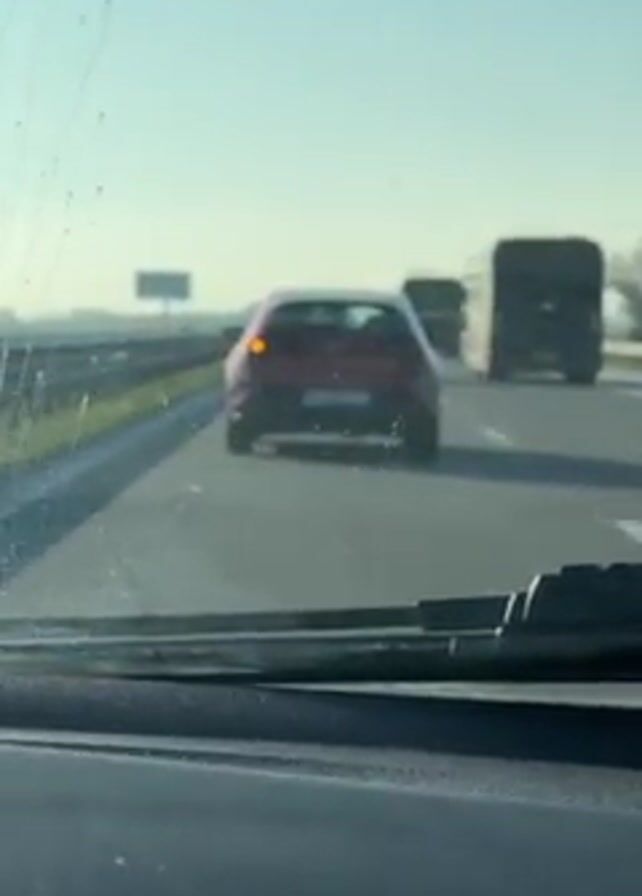 car driving on a highway, as seen from the driver's perspective through the windshield. In front of the car is a red hatchback vehicle. Further ahead in the distance, a bus and a truck are visible, also moving along the highway. The sky is clear and bright. The windshield of the car has some water spots. The wiper blade is visible.