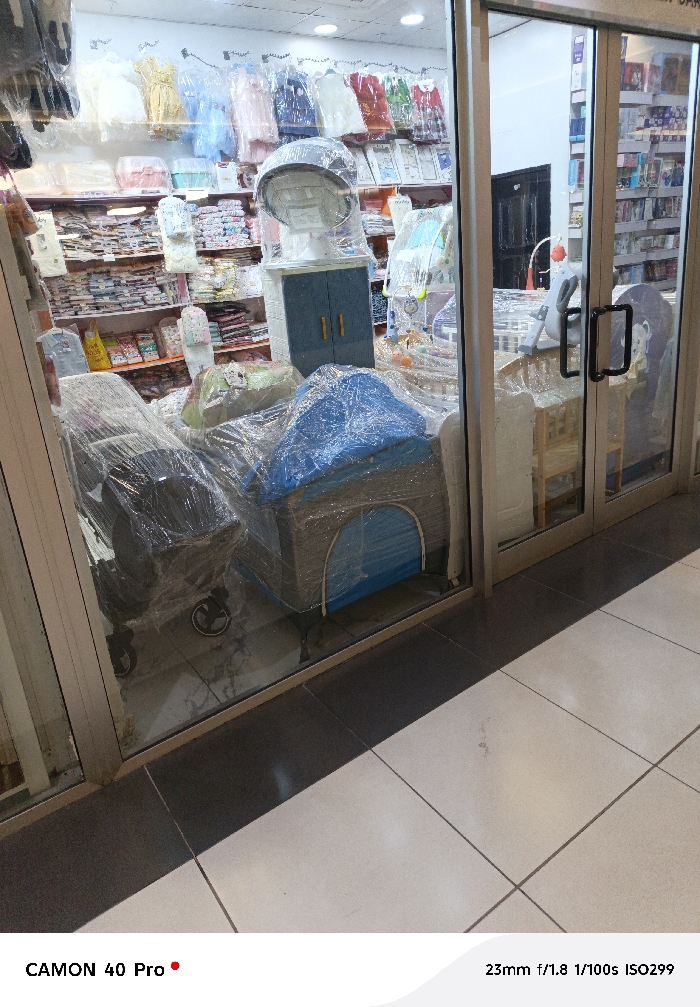 A shop window displays an array of baby items, including clothes, a baby swing, a crib, and a playpen wrapped in plastic. A blue cabinet stands near the center, topped with what appears to be a salon hair dryer, also plastic-wrapped. The items are densely packed on shelves within the shop. The foreground features a tiled floor, partially obscured by shadows. The shop's entrance has glass doors with silver frames.