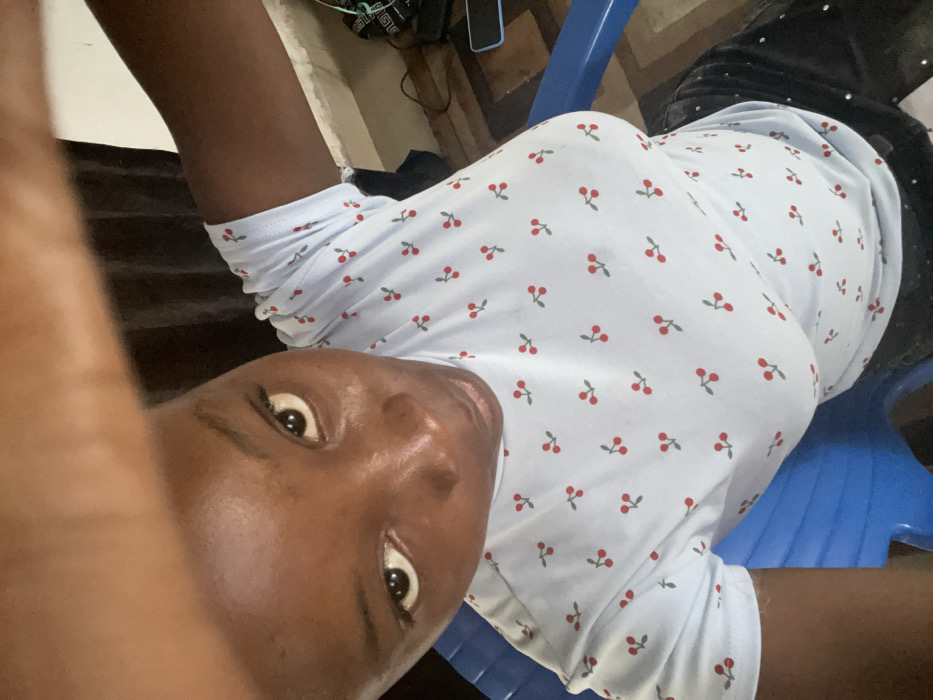 A person with brown skin and dark brown eyes, wearing a white top with a cherry print, is positioned with their head facing the camera, creating a low-angle view. The person seems to be sitting on a blue plastic chair. A blurred hand is visible in the foreground, obscuring part of the view. The background includes parts of a black surface, likely a piece of furniture, and some items on a shelf.