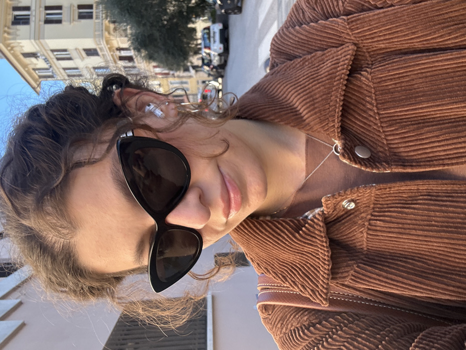 A female individual is depicted in a close-up portrait, likely a selfie, in an urban environment identified as Genoa, Italy. Her face is partially visible, wearing dark, cat-eye style sunglasses that obscure her eyes. She has fair skin and light-colored lips. Her brown, curly hair is pulled back, with some loose strands framing her face. The visible right ear features a silver-toned ear cuff on the upper helix and a silver-toned hoop earring in the lobe. The subject wears a brown, wide-wale corduroy jacket with a pointed collar and silver-colored snap buttons, unfastened. Beneath the jacket is a plain brown crew-neck shirt. A thin silver-colored necklace with a small, circular pendant rests against her chest. A brown strap with white stitching, consistent with a shoulder bag, is visible on her left side. The background reveals an asphalt street with parked white automobiles along the right side. Multi-story buildings with light-colored facades, windows, and balconies line the street, characteristic of European urban architecture. A sparse tree or bush is also visible on the right side of the frame. The scene is illuminated by bright, natural daylight, indicating an outdoor setting during the daytime.